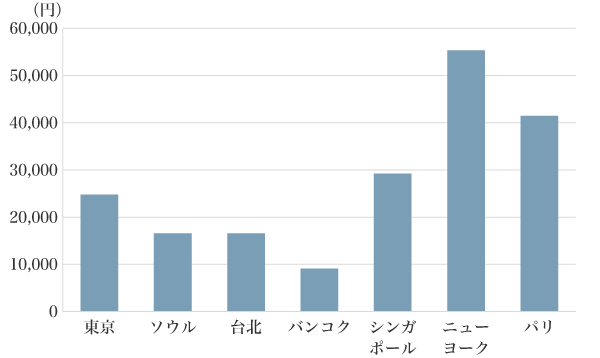 例えば、ホテルの宿泊費を比較してみると分かりやすい。海外旅行者数が特に多い都市の宿泊費をグラフにしたものだ(図3)。これを見ると、おおまかな状況がつかめるだろう。