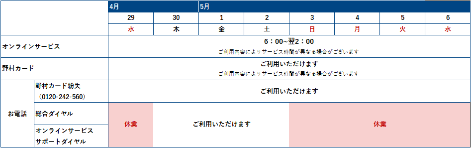 2026年4月29日(水)~5月6日(水)にかけて野村の各種サービスのお取扱時間をご案内させていただきます。