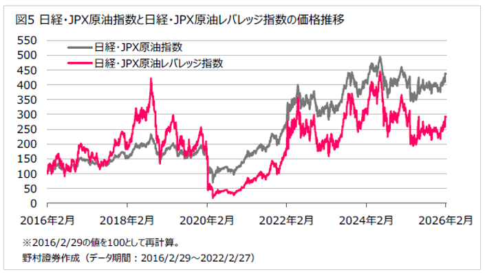 図5に、日経・JPX原油指数と日経・JPX原油レバレッジ指数(ドバイ原油先物ダブル・ブル ETN(2038)の連動対象指標)の比較を示しました。