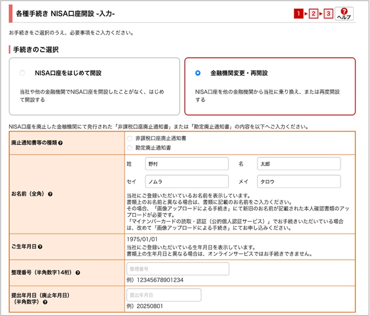 NISA口座開設-入力-画面では「金融機関変更・再開設」をご選択のうえお手続きください。