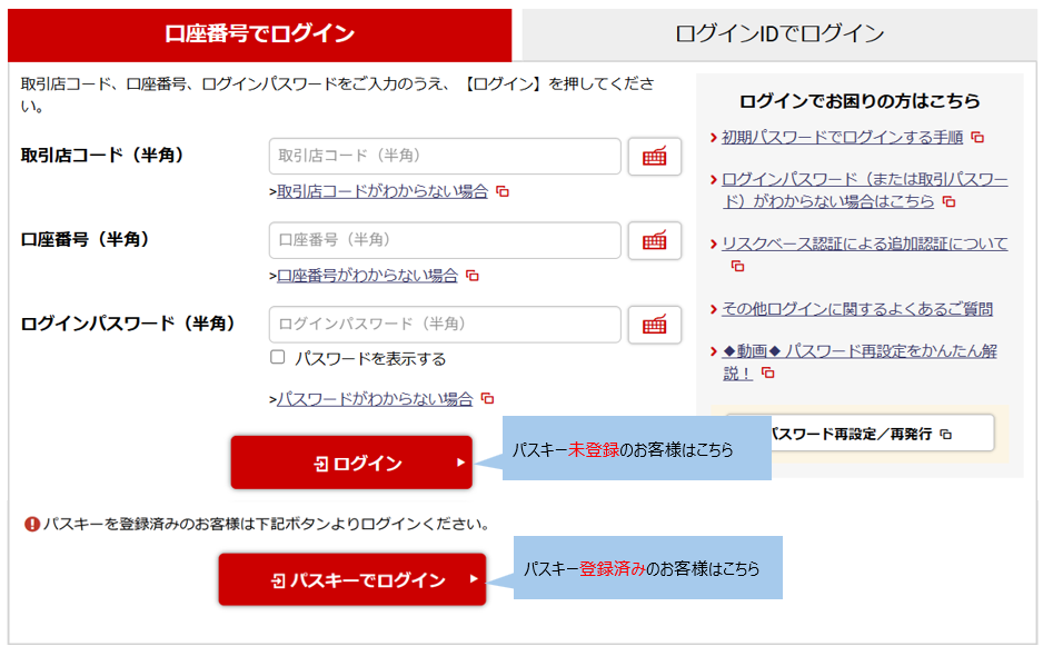 ログインパスワード等でログインしていただいても、ご利用いただける機能やお取引時の認証方法などに差異はありません。