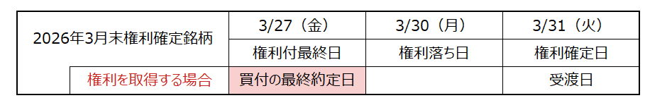 3月末権利確定銘柄の権利を得るには3月27日(金)までの買付・保有が必要です