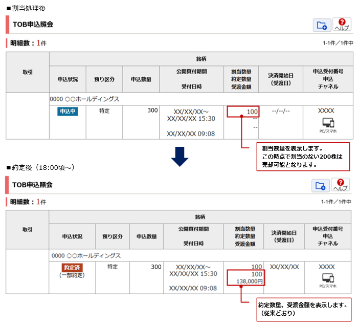 - 「TOB申込照会」画面で新たに「割当数量」を表示します。