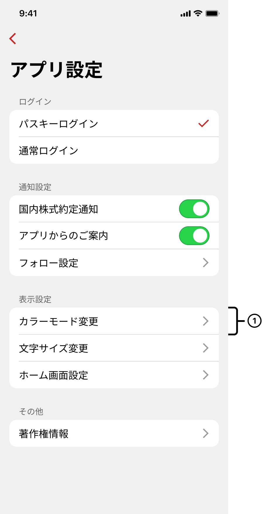 メニューの「アプリ設定」から、カラーモード(ダークモード)の選択を行えます。