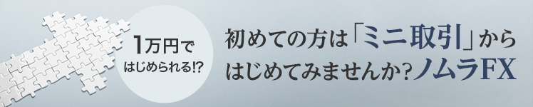 ノムラFXでは、米ドル/円、ユーロ/円、英ポンド/円、豪ドル/円の4通貨ペアは、1千通貨単位から取引(ミニ取引)が可能で、1万円程度で取引がはじめられます。いきなり取引するのは不安という方は、この「ミニ取引」からはじめてみてはいかがでしょうか?