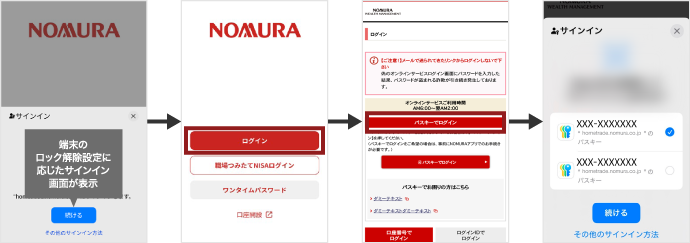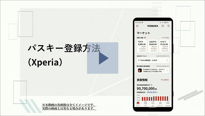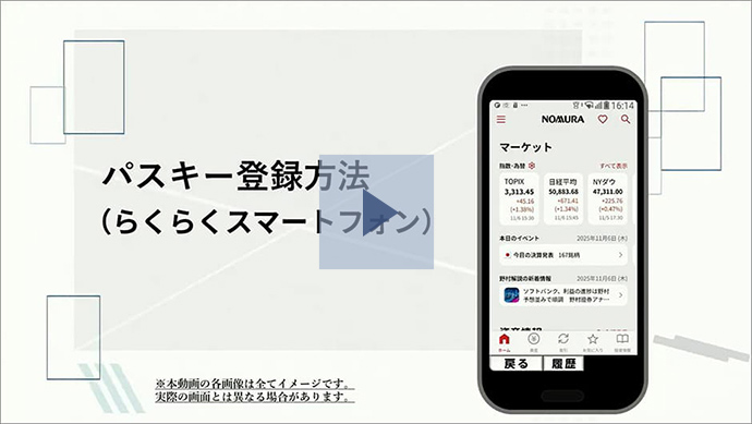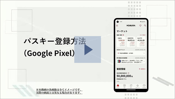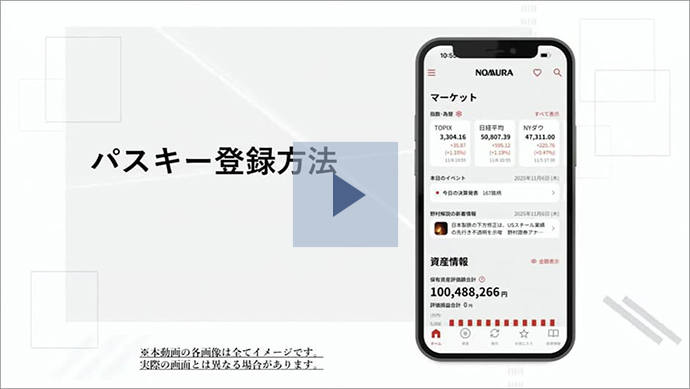 - ※なお、NOMURAアプリは11月29日(土)以降、ログイン時にパスキー認証を必須とし、引き続きワンタイムパスワードでお取引時の追加認証を行います。