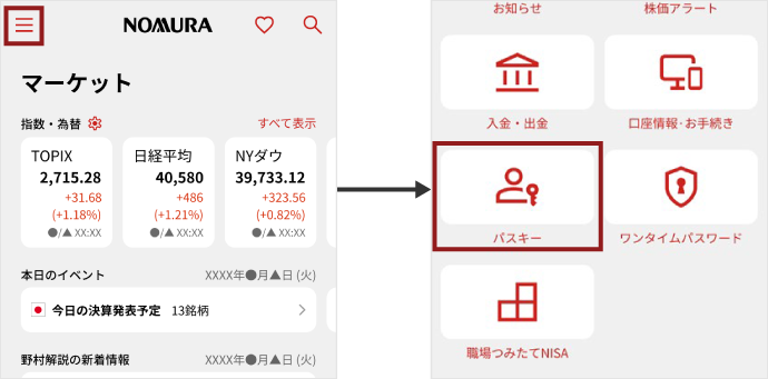 - 1.NOMURAアプリホーム画面左上のメニューから、パスキーを押下します。