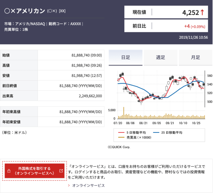オンラインサービスで取扱いを行っている「米国・香港・ドイツ・オーストラリア」市場の株式は、株価や株価指数をご覧いただけます。