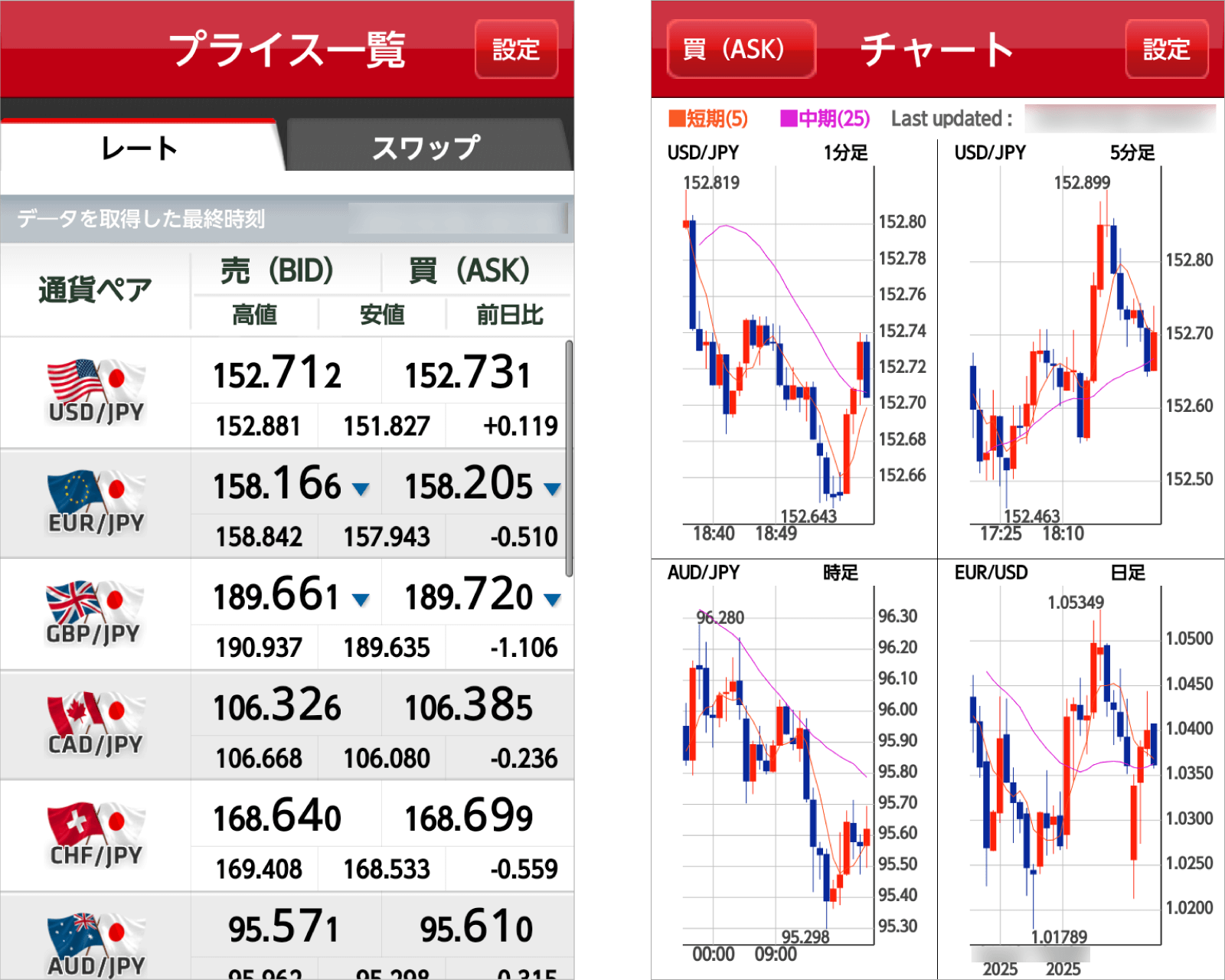 アプリを起動すると「プライス一覧」画面が表示され、リアルタイムの為替レートがすぐに確認できます。
