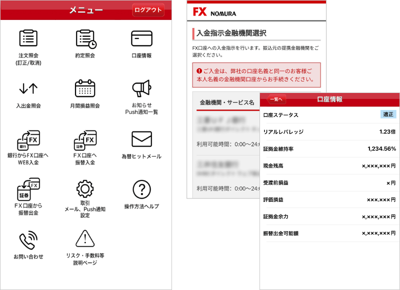 口座状況の確認や、銀行口座からFX口座への直接入金はメニューから簡単に操作できる