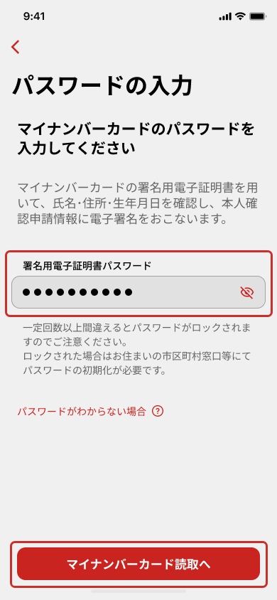 - マイナンバーカード用パスワード(署名用電子証明書用パスワード:英数字6~16桁)