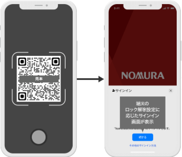 読み取り用の二次元コードが表示されますので、NOMURAアプリが入ったスマートフォンのカメラで二次元コードを読み取ります。