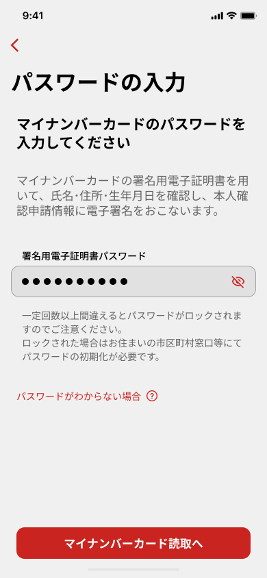 署名用電子証明書パスワードを連続で間違えた場合、パスワードがロックされます。住民票のある市区町村の窓口等でロック解除のお手続きを行う必要があります。