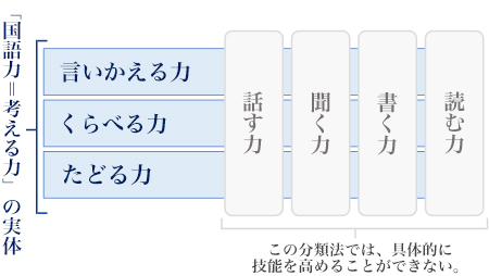 よく「話す力・聞く力・書く力・読む力」が国語力そのものだと思っている人がいるが、これらは形式的な分類に過ぎない。国語力の実体とは、「言いかえる力」「くらべる力」「たどる力」の3つの手法。